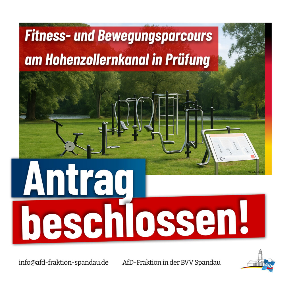 Das Bezirksamt wird ersucht zu prüfen, ob auf der Wiese am Hohenzollernkanal ein Fitness- und/oder Bewegungsparcours aufgestellt werden kann.